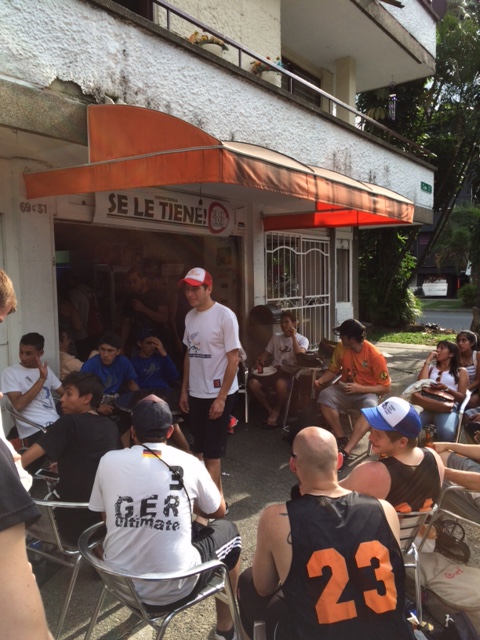 I want to start by saying that the TD and the Colombian teams that we have played have all been awesome. We have told all the teams we have played that this is the first international tournament in the 25 year history of Ring (pretty sure that’s true, possible exceptions being for worlds).  The city of Medellin has been very friendly and welcoming and a big bonus: There is tons of places with free wi-fi, which is great for those without an international plan and groupme/whatsapp is a great easy way to stay in touch. The hostel that TEP set us up with is very affordable and perfect for what we need for the weekend. Hotel Zandalo is in between the two field sites and everything we need is within walking distance. The food here is great and most places are very cheap. We paid 9,000 Colombian pesos (roughly $3.50 USD) for a meal with chorizo, a salad, potato wedges and these delicious little things that were essentially the love child of potatoes and hush puppies. Beers are usually around 3,000 Colombian pesos (roughly $1.20 USD) on the main street and as cheap as 1,500 Colombian pesos near the stadium (roughly $.60 USD). The language barrier is pretty difficult and we usually just end up handing them money and hoping they give us the correct amount back. We are very reliant on Tristan to take control in all communication situations.